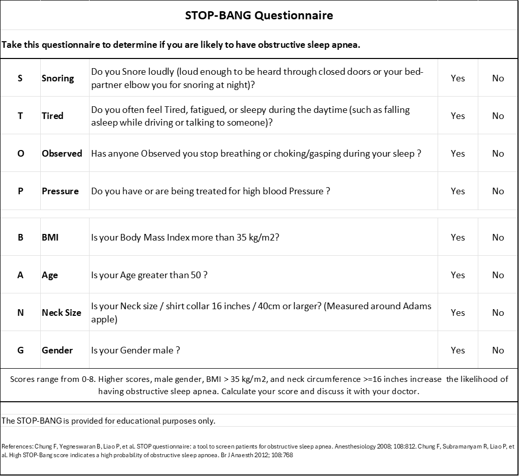 Answer: Obstructive sleep apnea is suspected when the bed partner can hear the person snoring, choking, or gasping. There is a screening tool called the STOP BANG Questionnaire. A higher score makes it more likely that a person has obstructive sleep apnea.